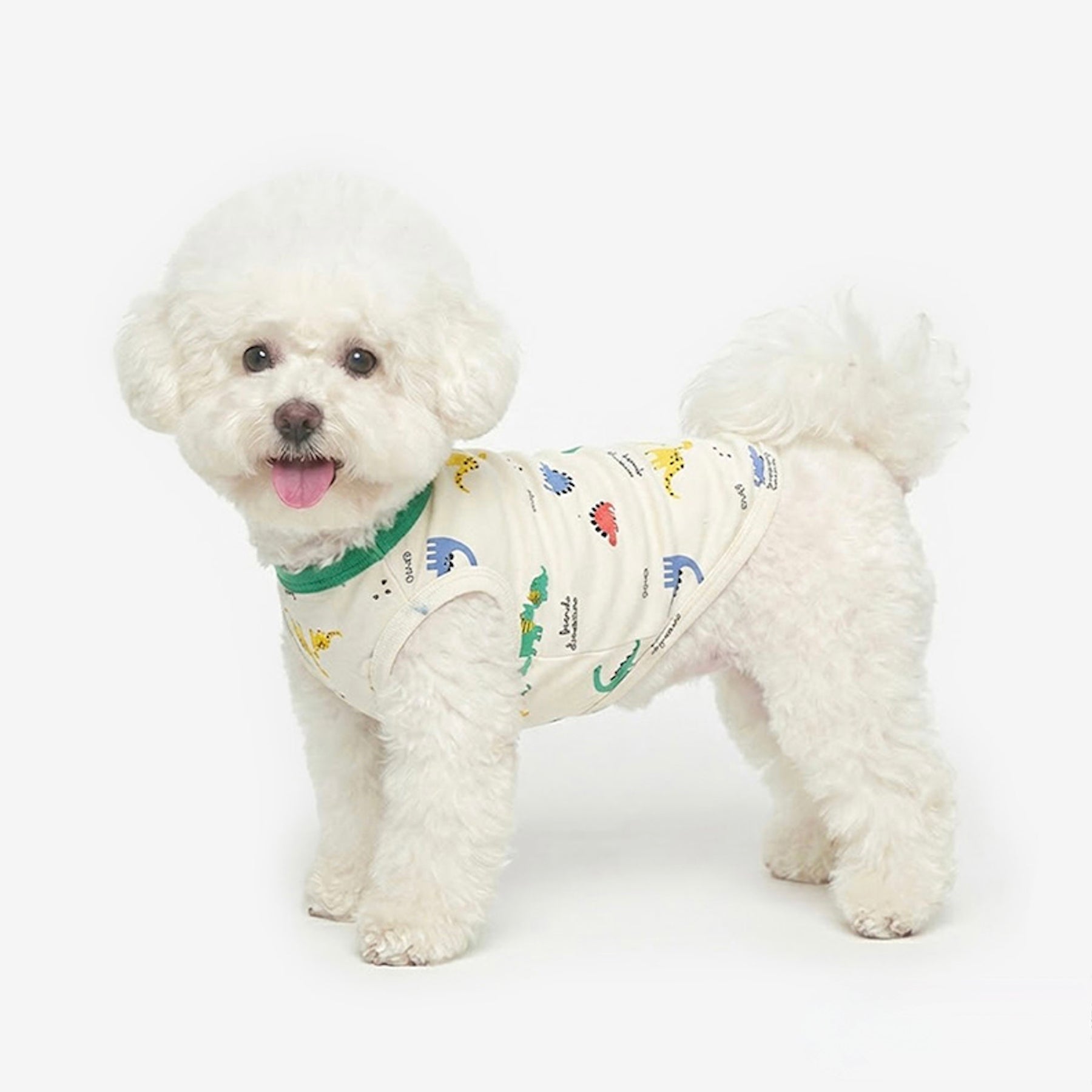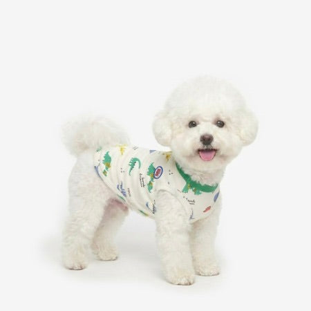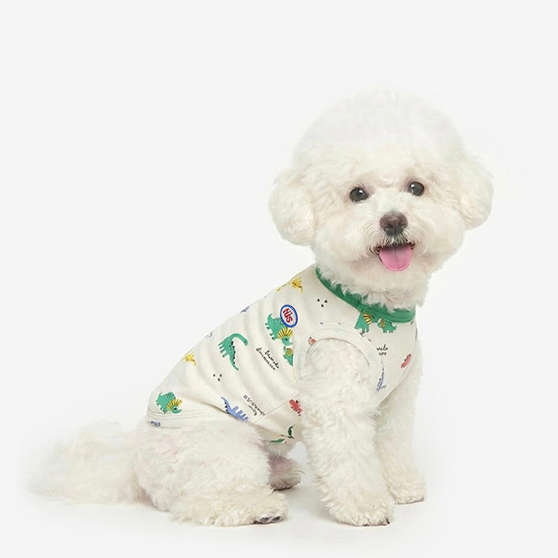 デザインされた恐竜柄のプリントが子供服のようなスリーブレス。