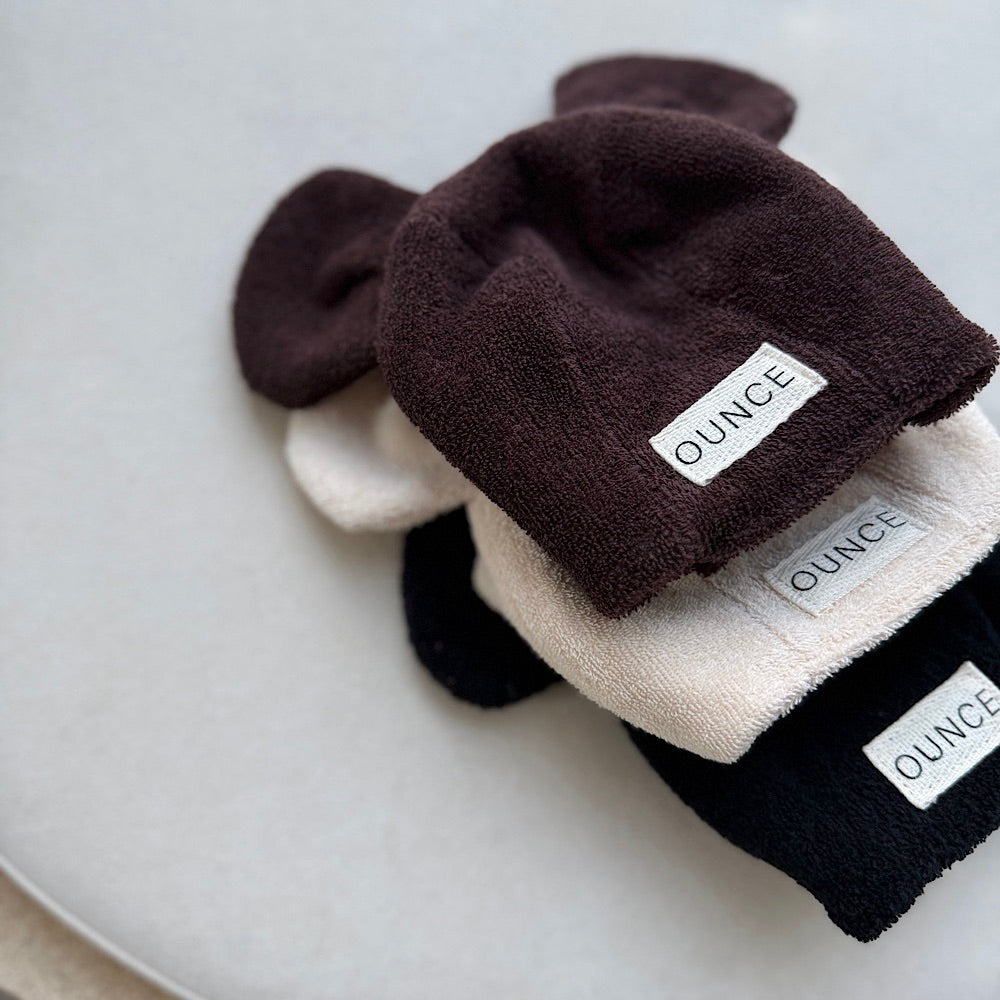 クマの形のボンネット(帽子)もベストと同じプレミアムテリー素材で作られており、軽くて柔らかいフィット感で、お子様に負担が少なく、ベルクロタイプで手軽に着用できます。