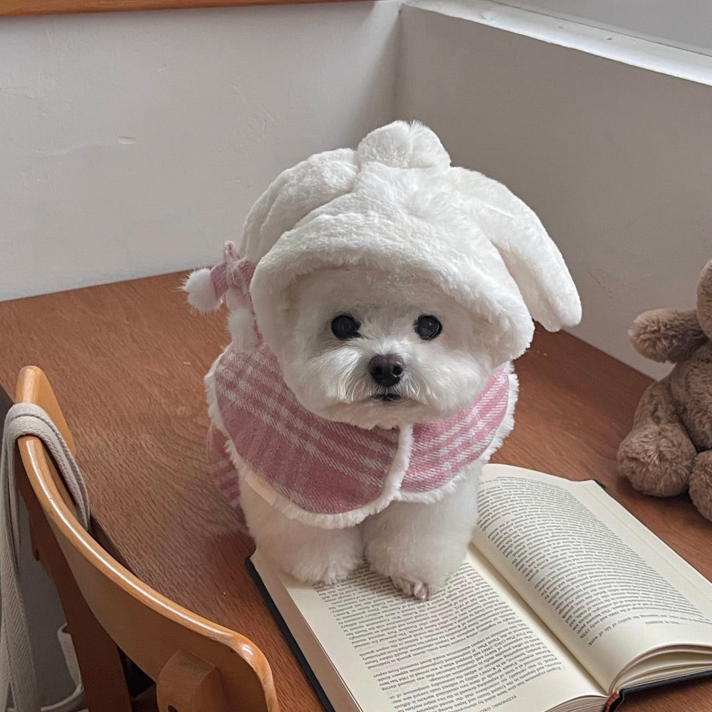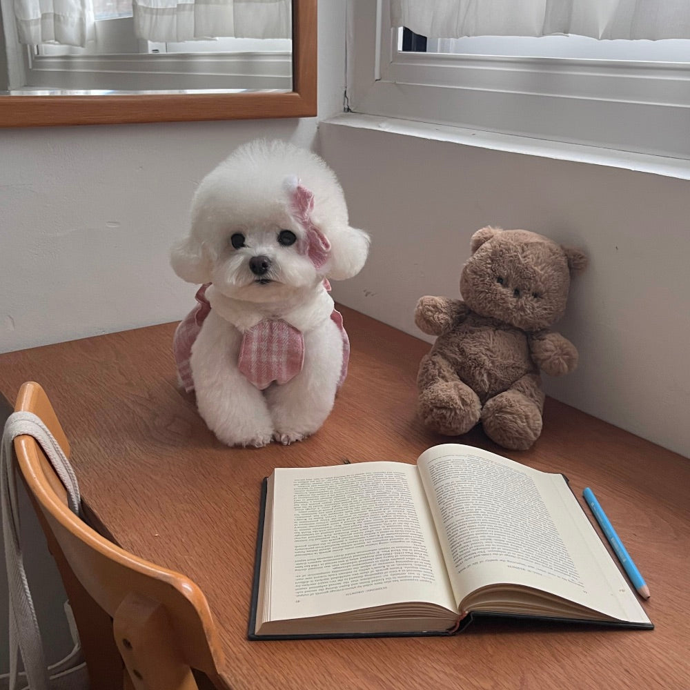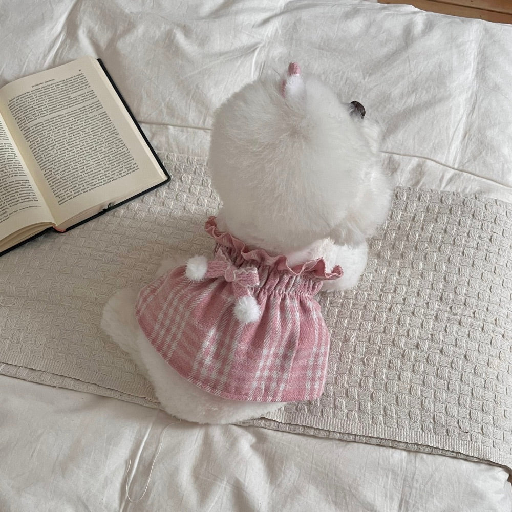 温かみのあるチェックパターンのワンピースに、エコファーの肩ひもを加え、優雅でラブリーなムードのワンピースです。