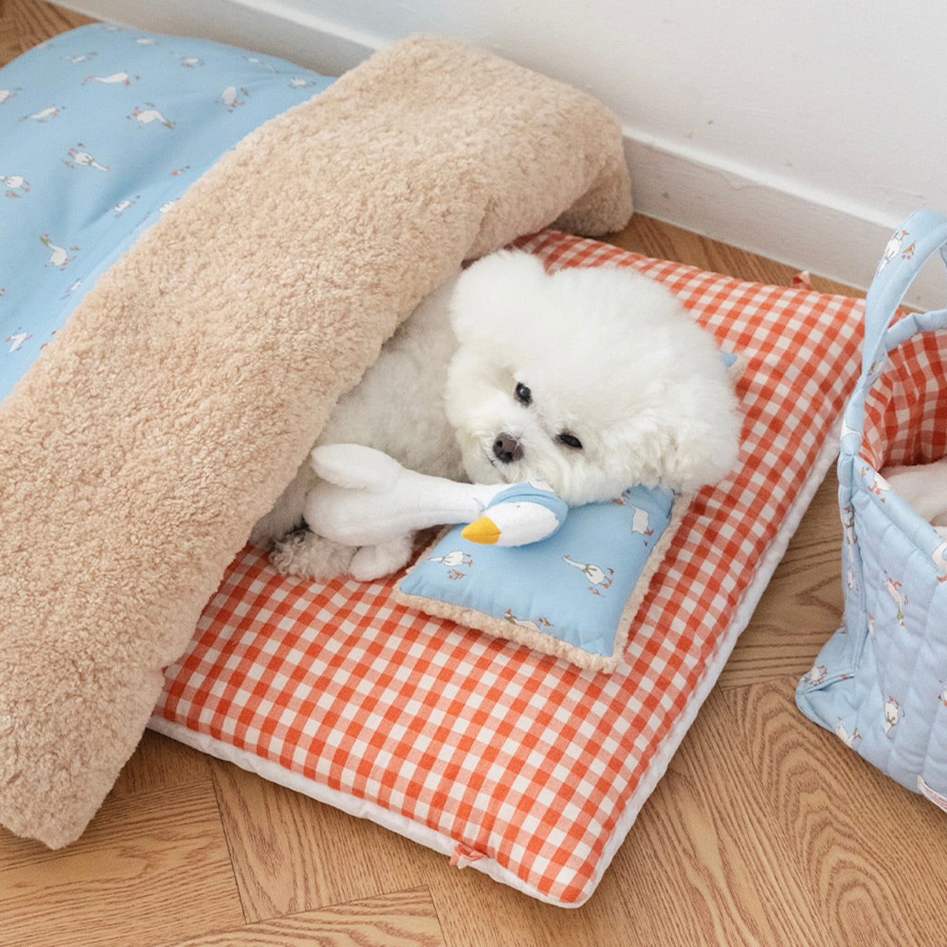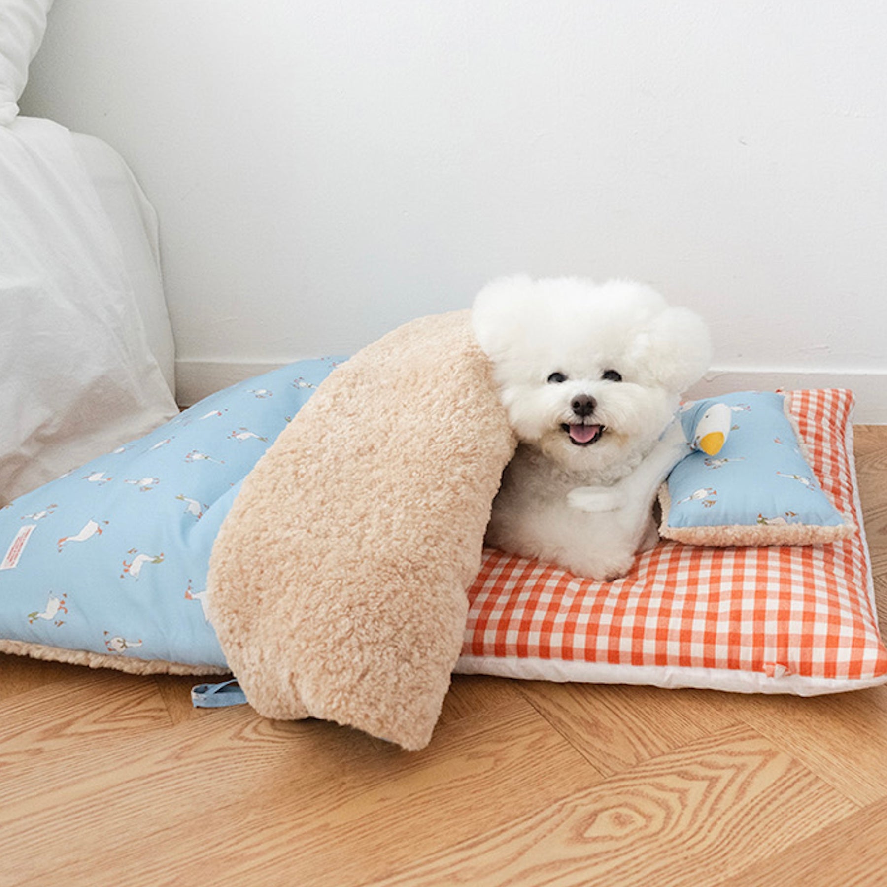 掛け布団、枕には人肌掛け布団に使われる60番手の高密度綿生地にかわいいアヒルの総柄プリントが施してあり、クッションは暖かみのあるチェック生地で、布団の内側はふっくらとした柔らかいエコファーで作られており、暖かさはもちろん、ふんわりとした最高の手触りをお届けします。
