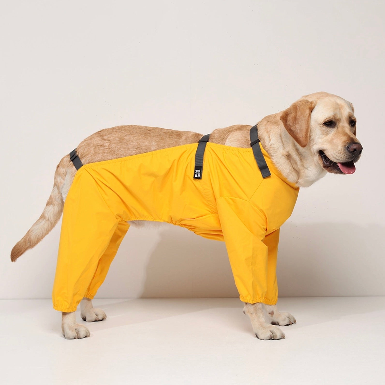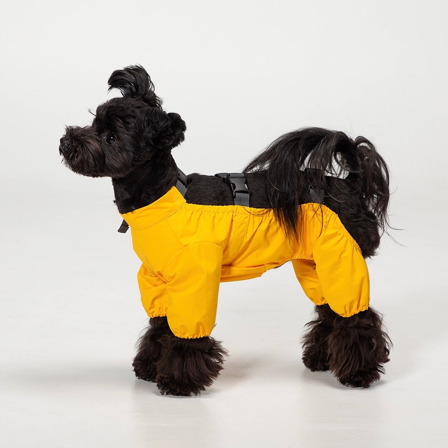 レインコートとボディスーツを結合した後、お尻の方にあるバンドを足に通すことで完璧に固定できます。