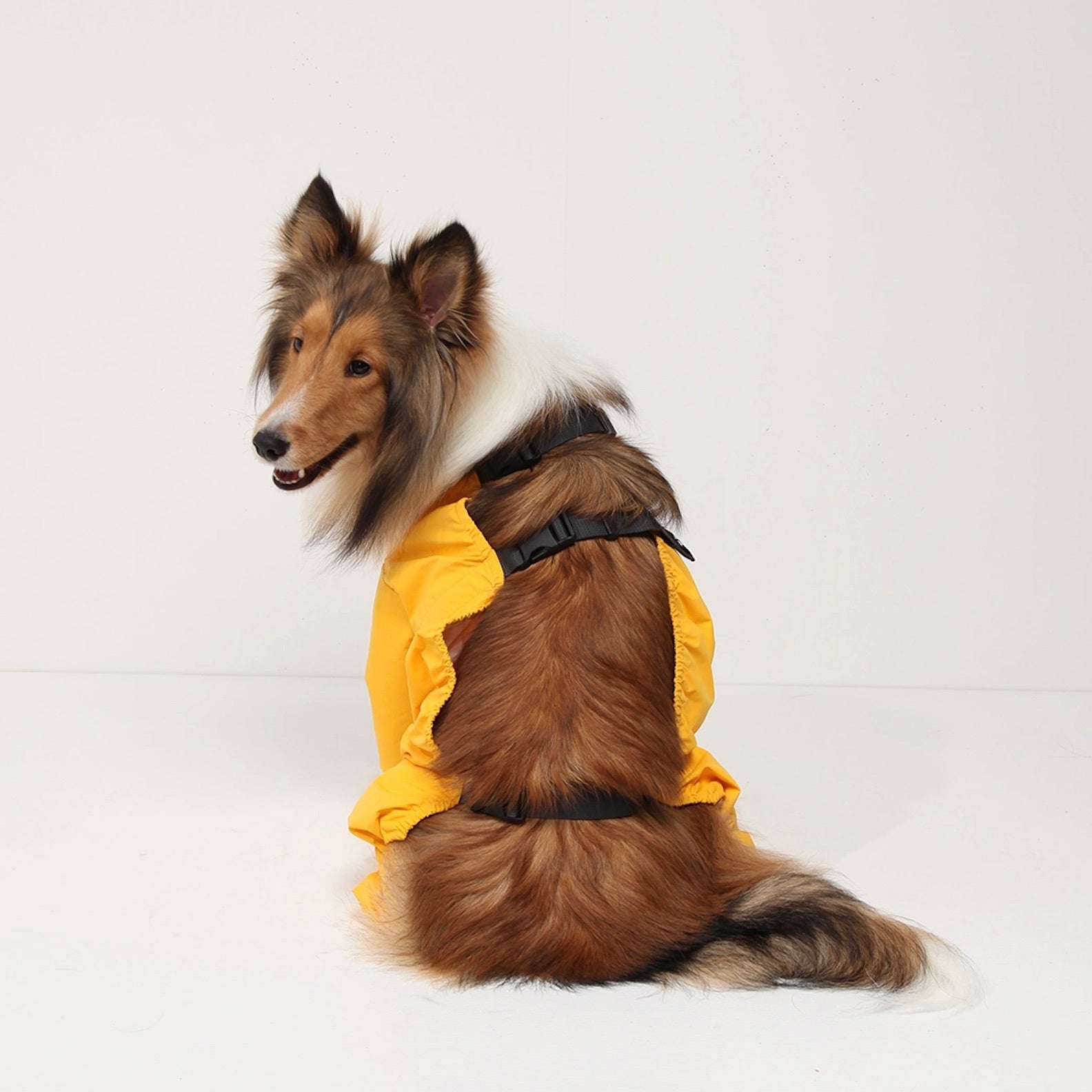 愛犬の前足と後ろ足を順番に着せて、背中のバックルを調整しながらサイズに合わせて着用して下さい