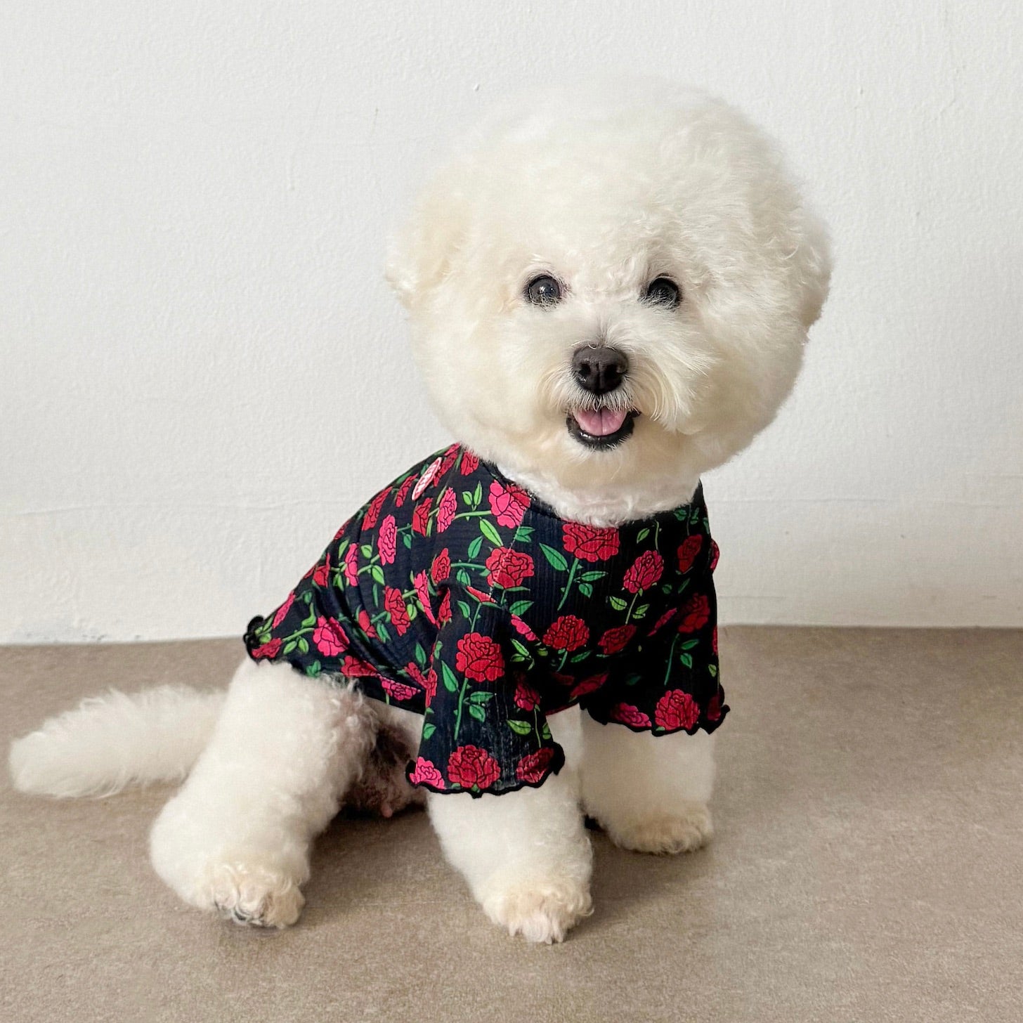 『薔薇の総柄とフリルがポイントとなったハーフトップス』