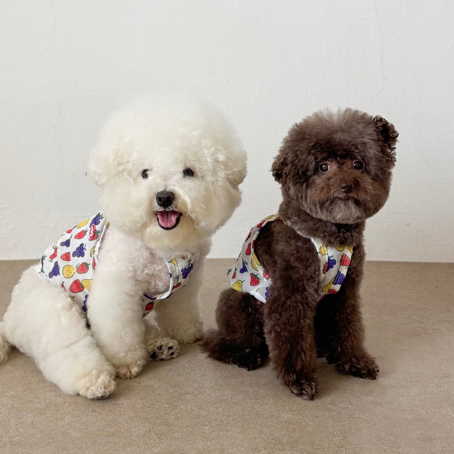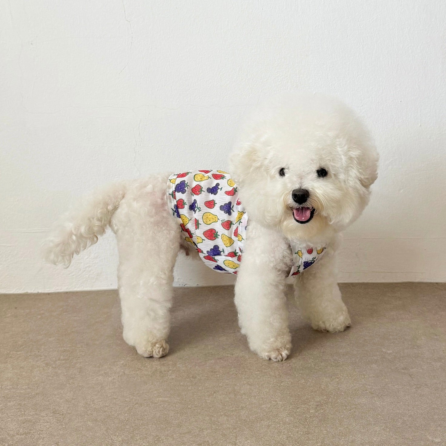 軽くて通気性の良いリップル生地に様々なフルーツが総柄でプリントされたキャミストラップトップスです