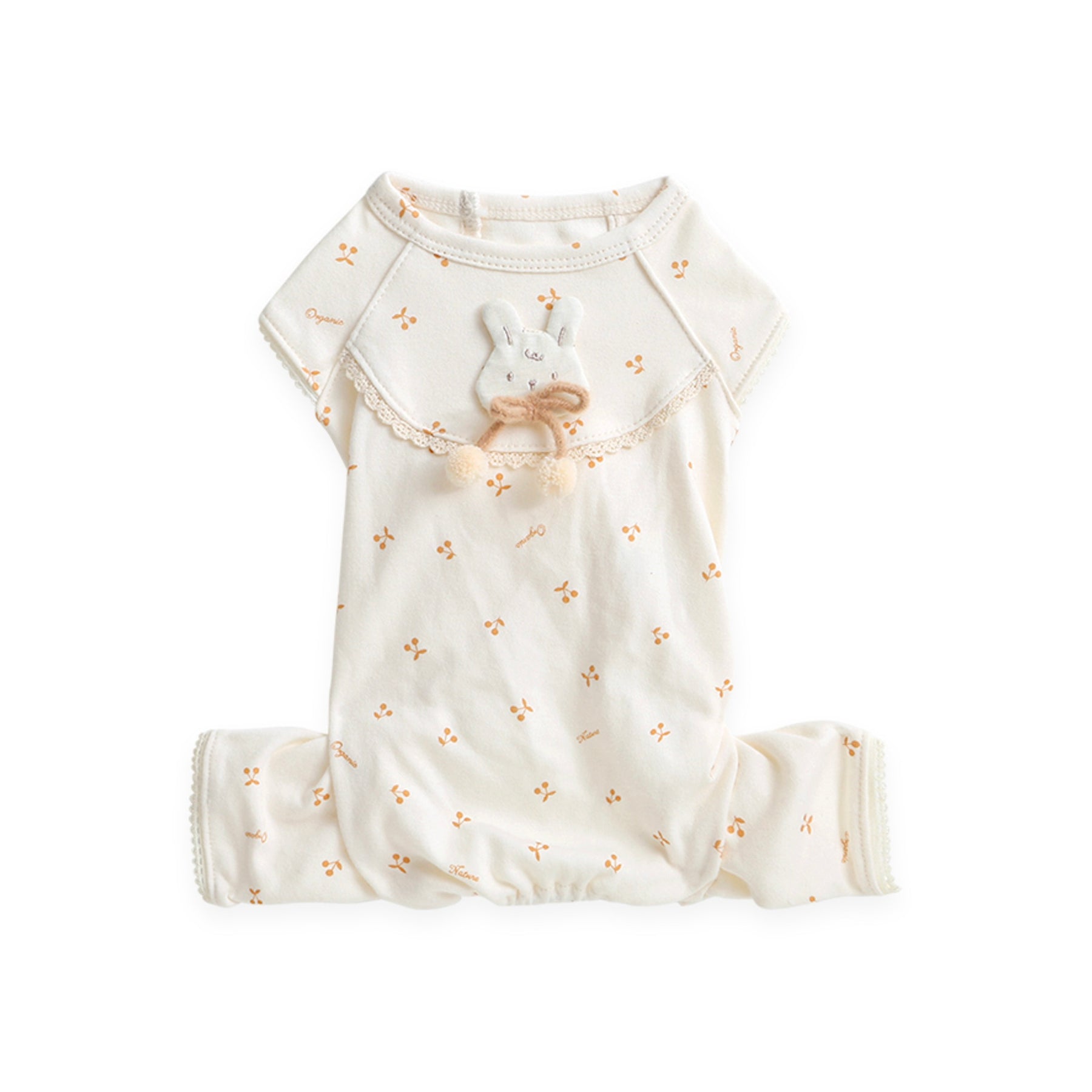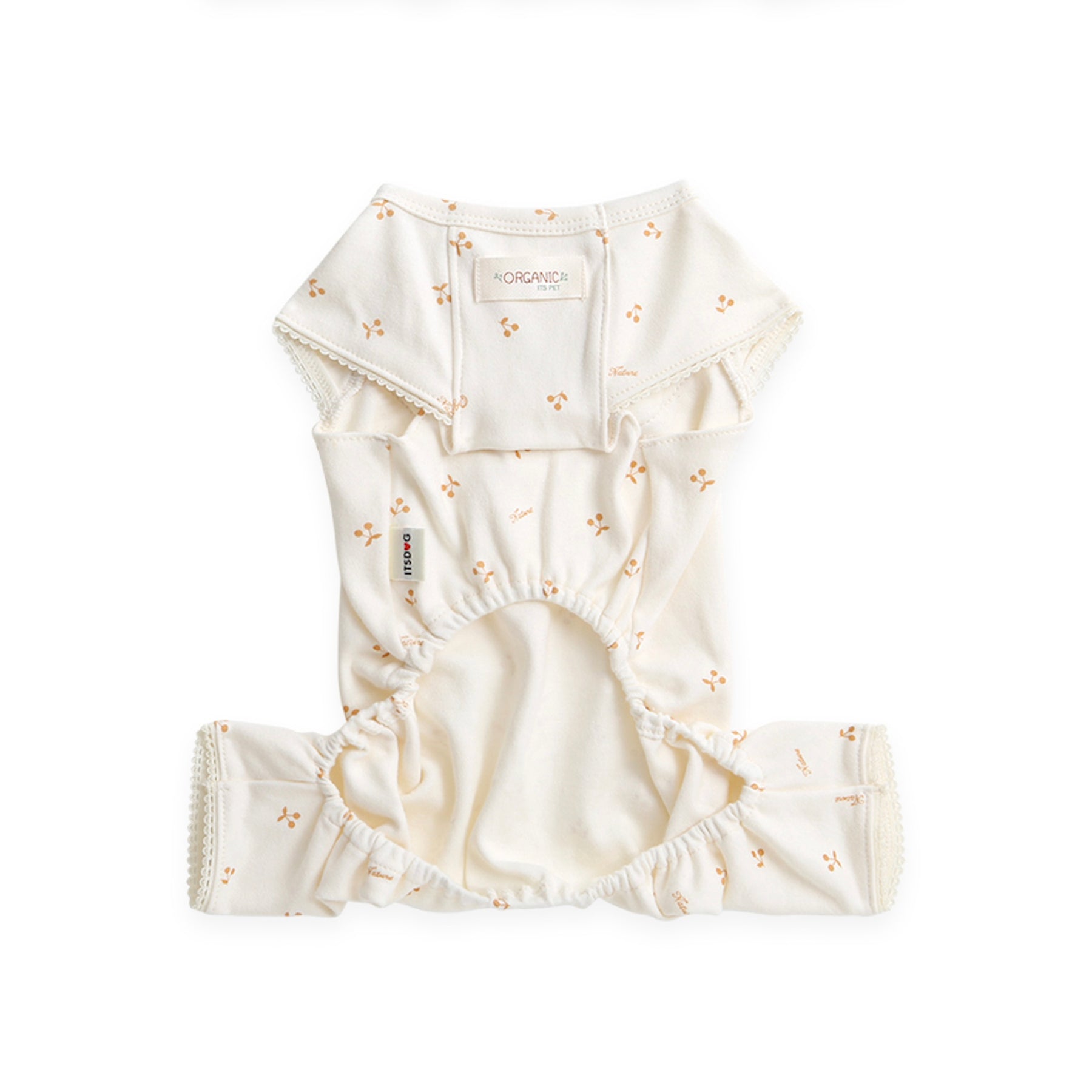 愛犬たちの大切な肌のために、オーガニック綿100%生地を使用した生地でできたオールインワンは、さくらんぼの可愛らしい総柄プリントに、背中についた立体的なワッペンと紐ディテールが愛らしいデザイン。
