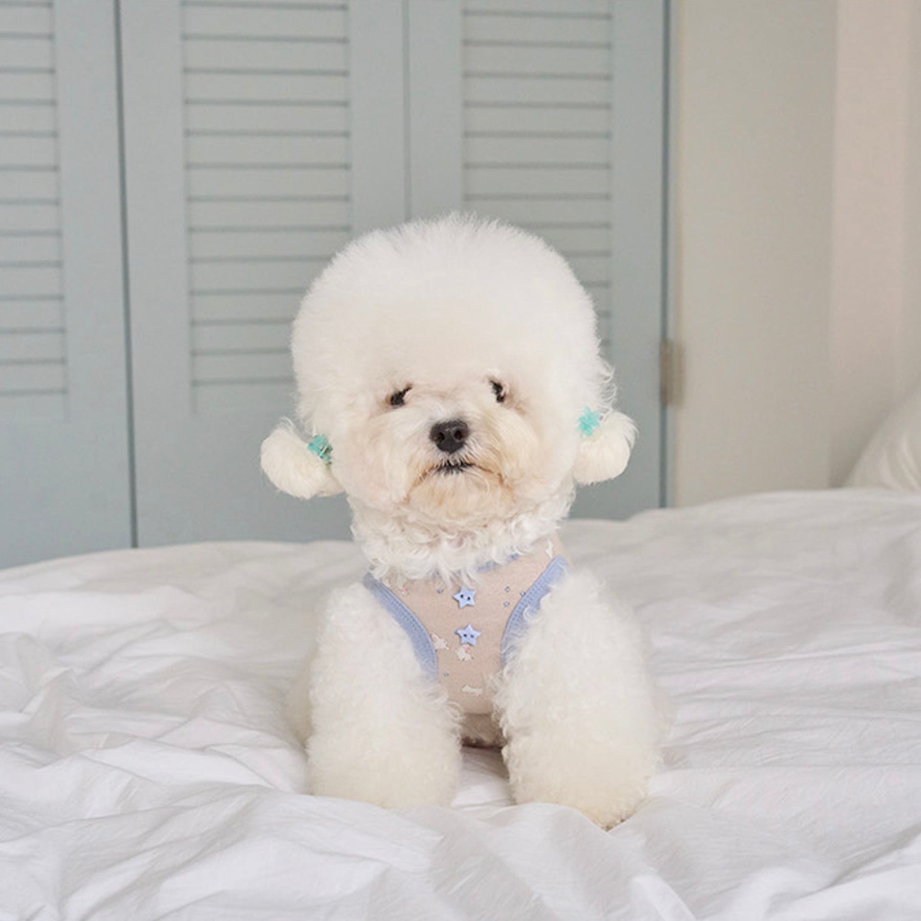 首元には首とアームホールに使われているポイントカラーと同じトーンの星ボタンを手で一つ一つ付けて愛らしさをプラス!