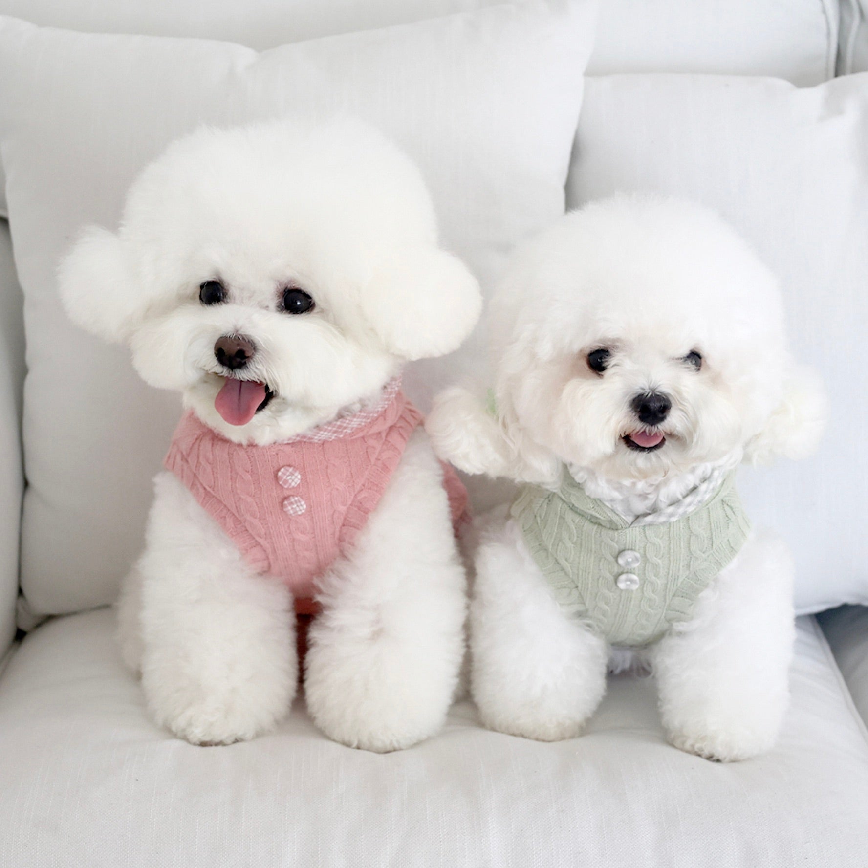 ニットカラーに合わせたアンゴラリボンやチェック柄の生地、首元のボタンディテールがポイントとなっています。