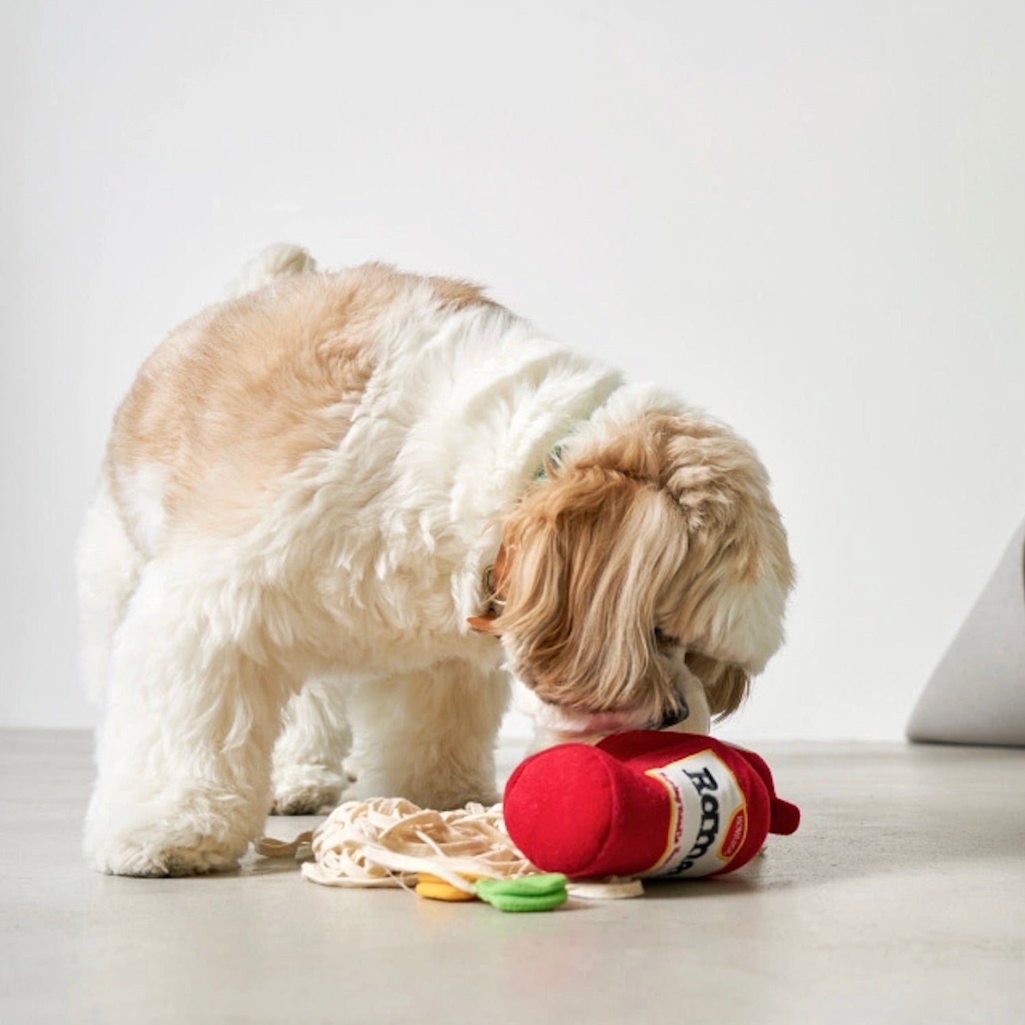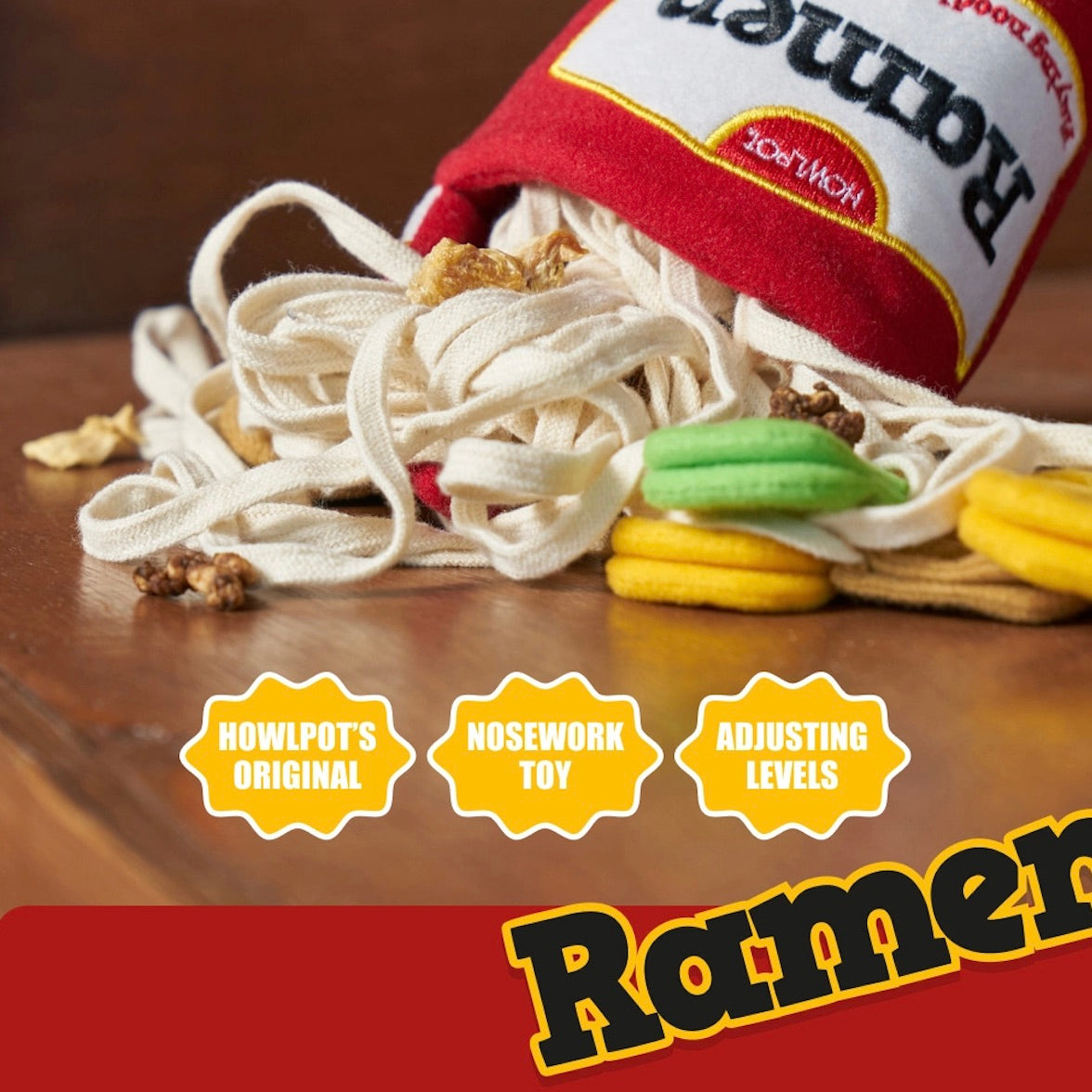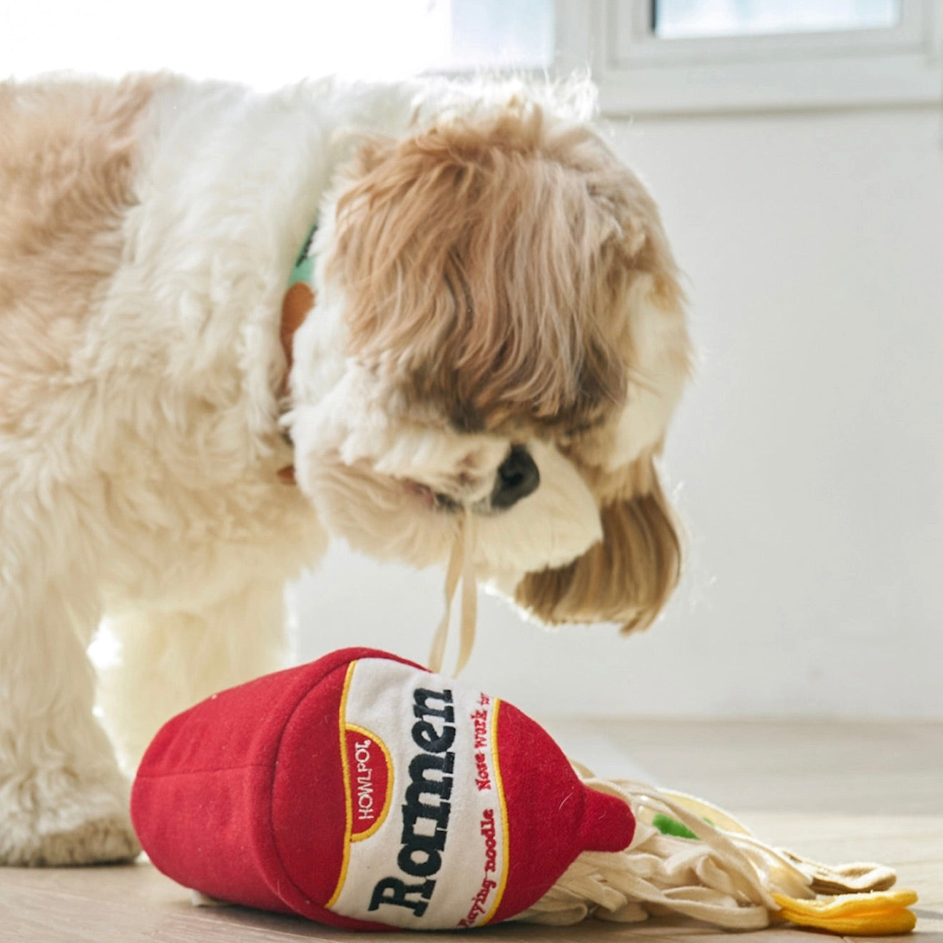 また、愛犬の優れた嗅覚を十分に刺激するラーメンのおもちゃは、麺と麺の間にある肉や野菜の中におやつを隠しておくことで長時間おやつを探して遊んでくれます!