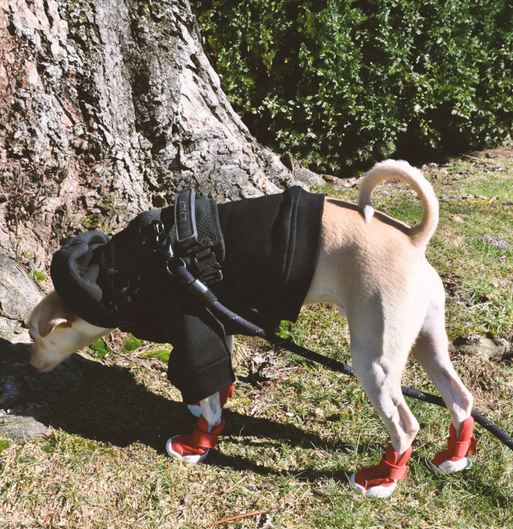 ・靴ははじめ履くのが苦手な子もいますが、苦手な子には練習と忍耐、そしてうまくいったら褒めるなどをすることで慣れていきます。最初の数日間は犬にフロントシューズのみを数分間履かせてから、徐々に4つすべての犬用シューズを履かせ、並行して毎日の犬用シューズの着用時間を増やします。