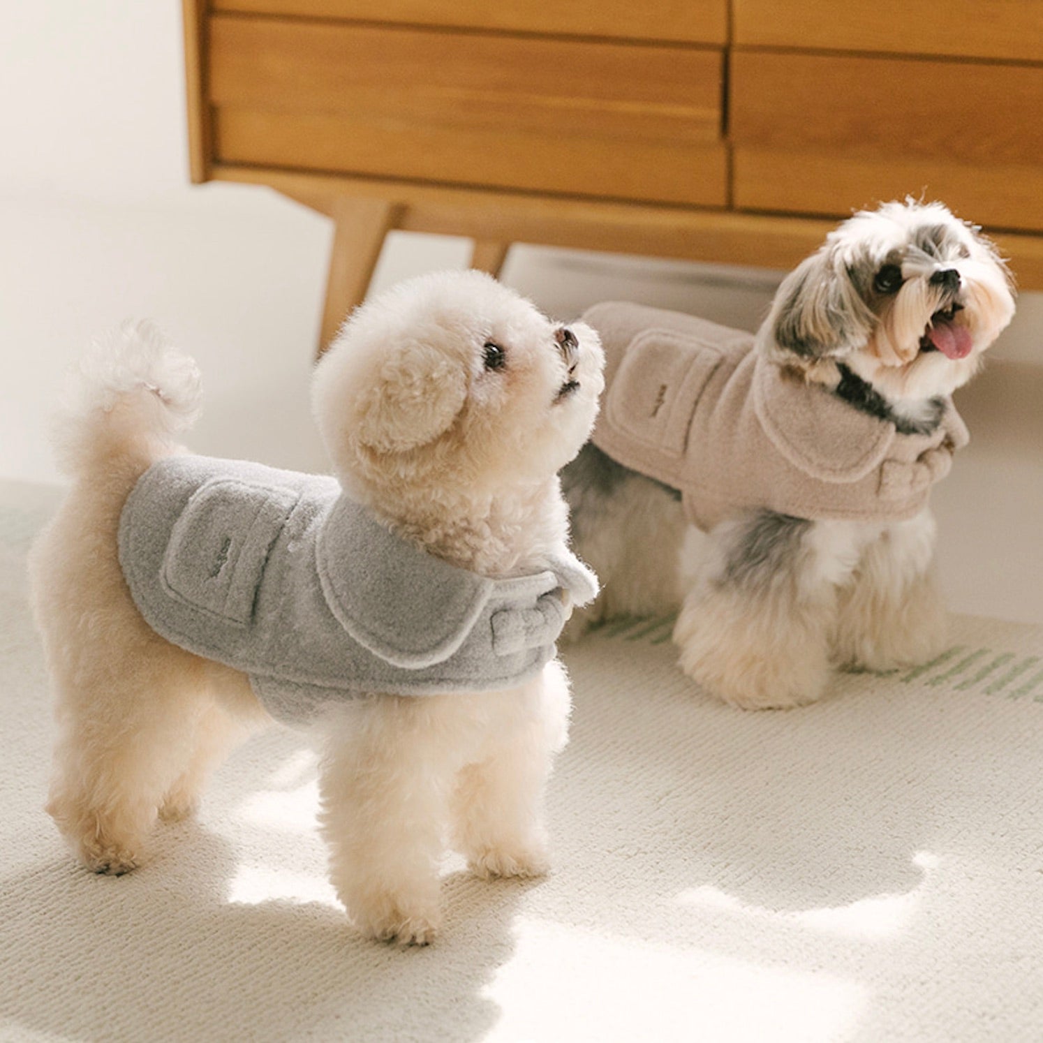 各商品ページに商品の実寸サイズや伸縮性の有無を記載しておりますので、そちらをご覧いただきペットに合うサイズをお選びください。