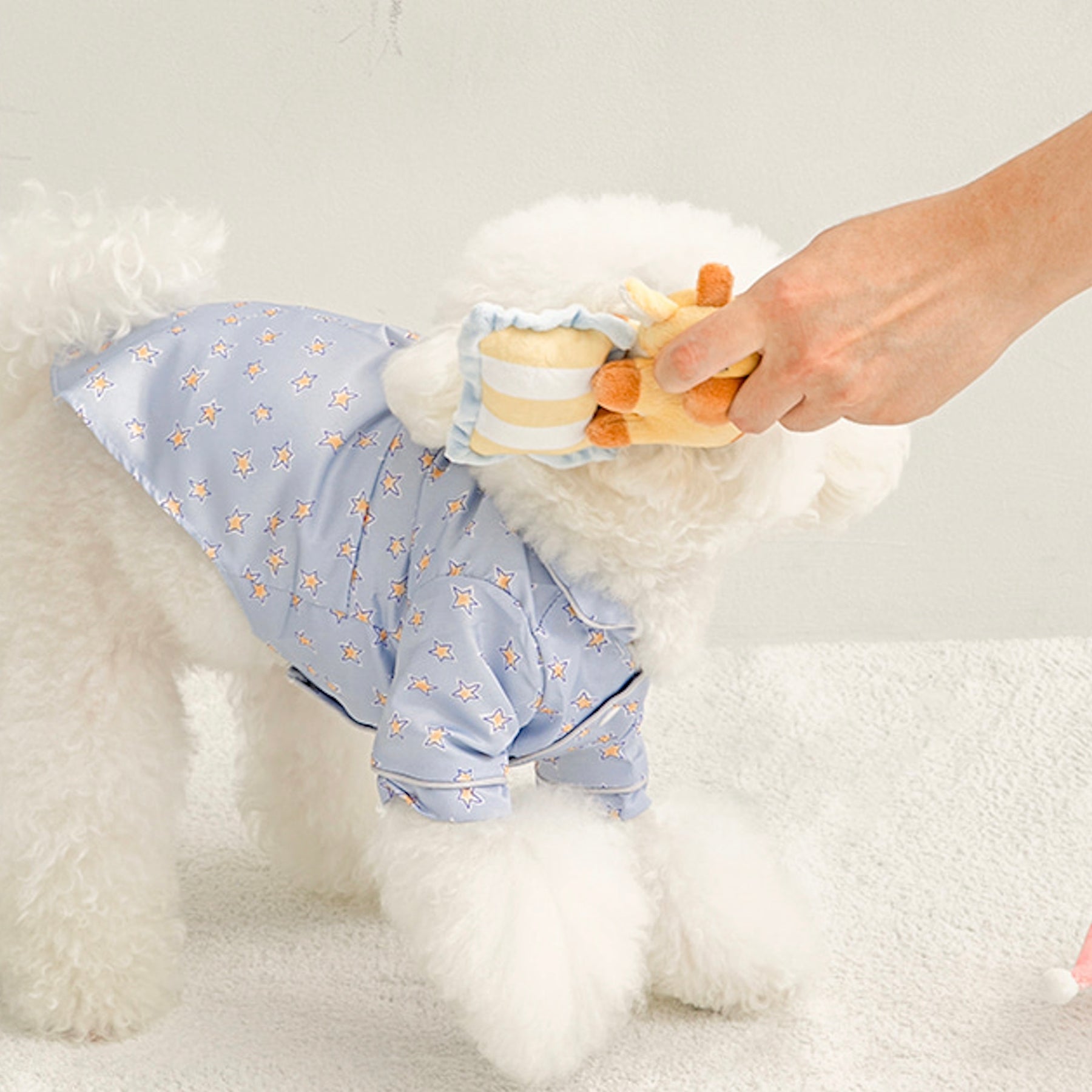 各商品ページに商品の実寸サイズや伸縮性の有無を記載しておりますので、そちらをご覧いただきペットに合うサイズをお選びください。