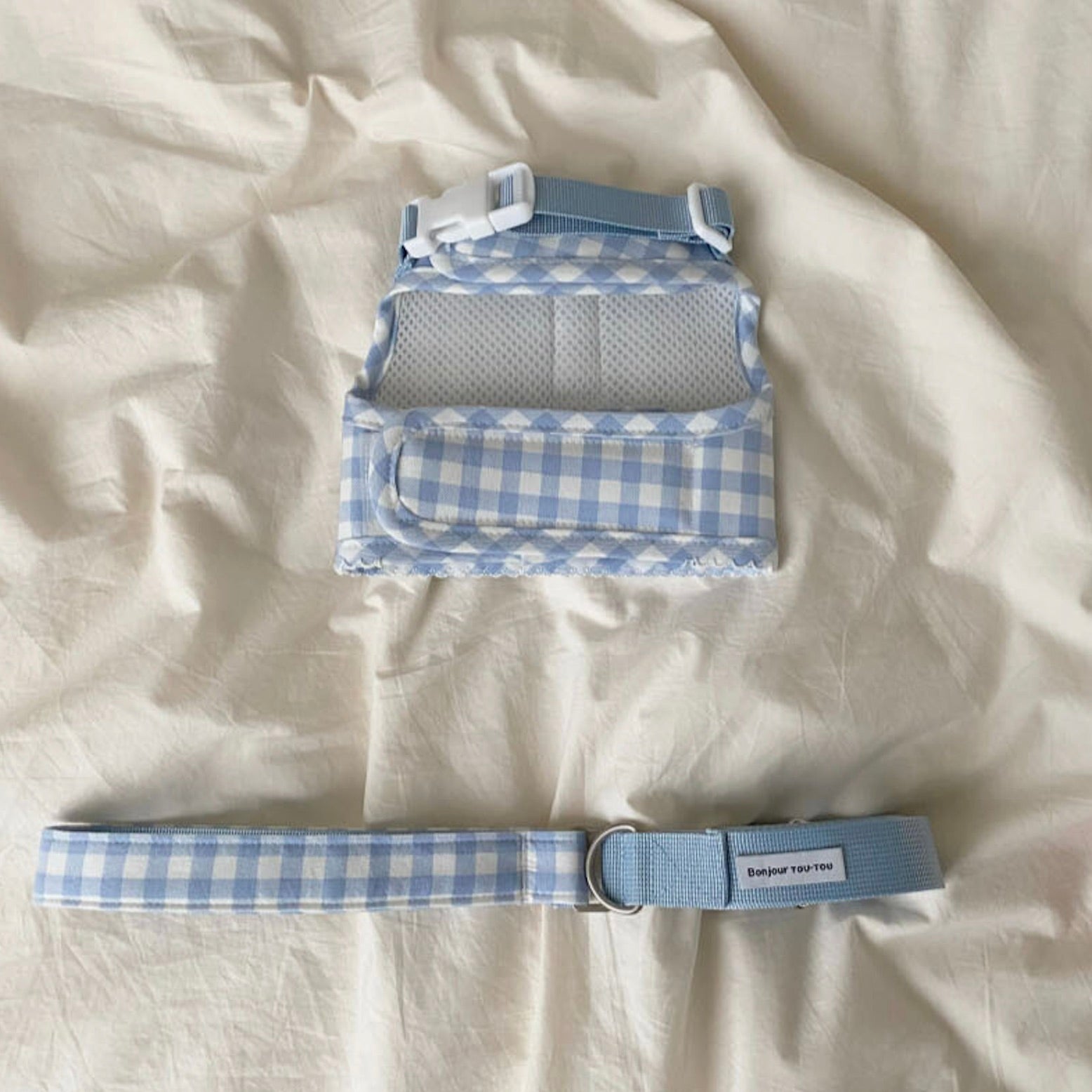 韓国で大人気のブランド"Bonjour TOU-TOU"のEyelet Check Harness(Sky)です。