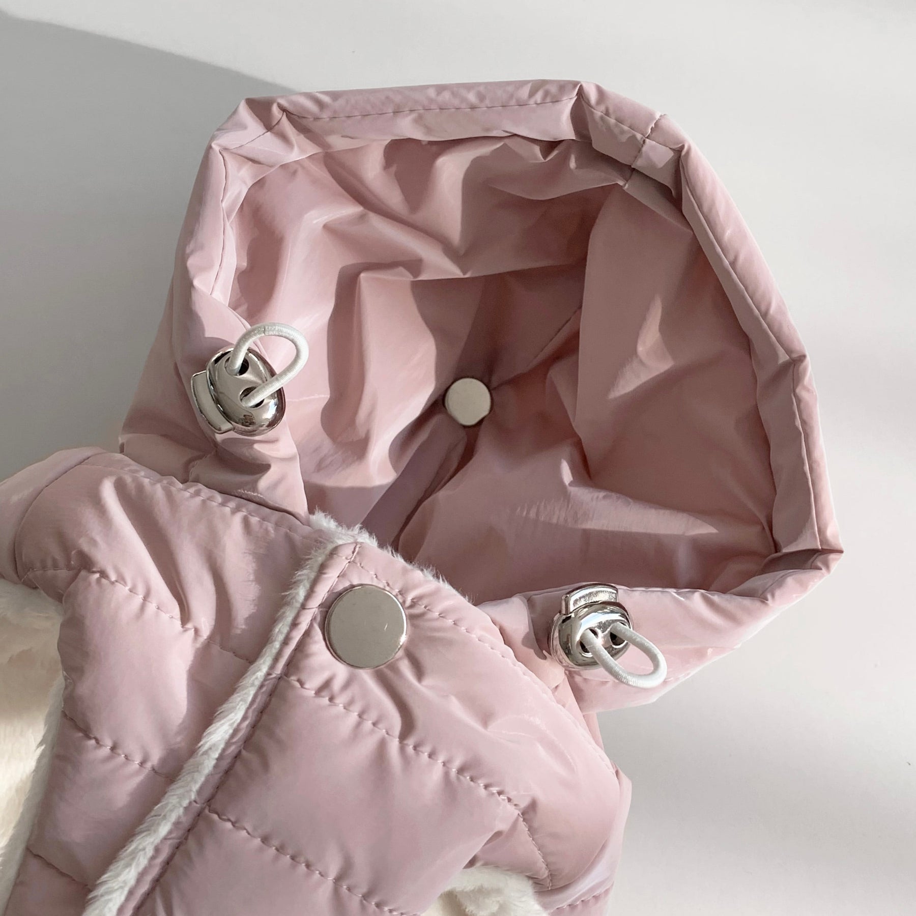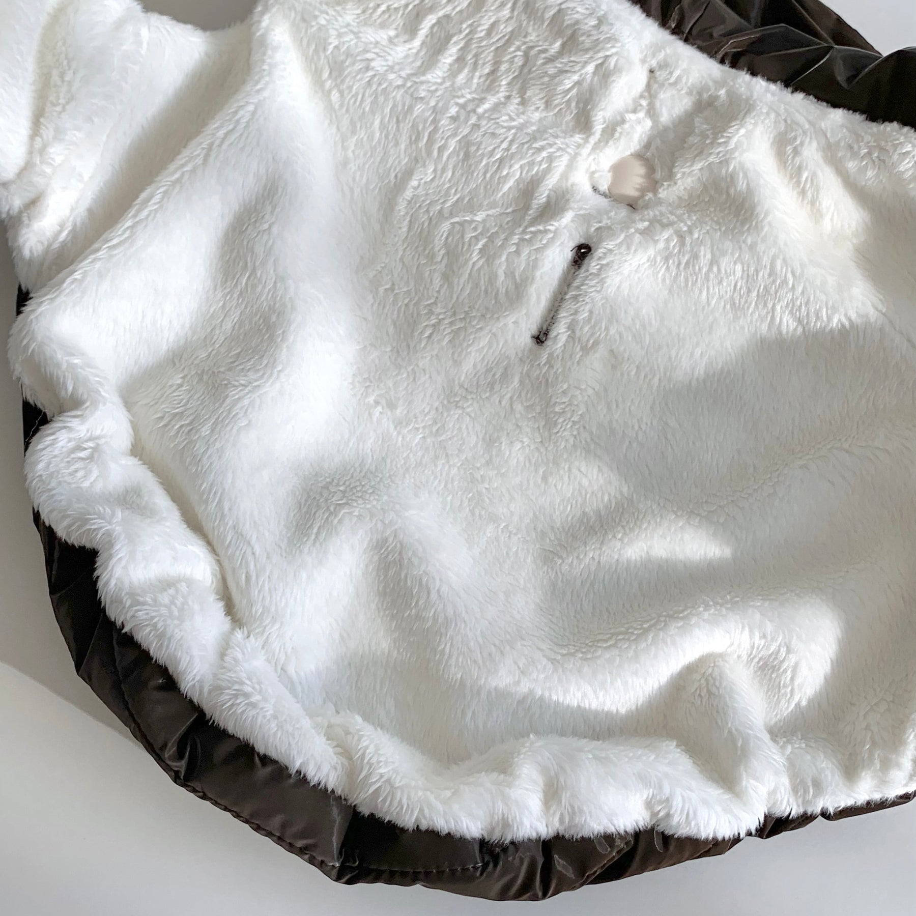 表地は生活防水のナイロン100%、裏地は柔らかいショートファーの生地で製作しました。
