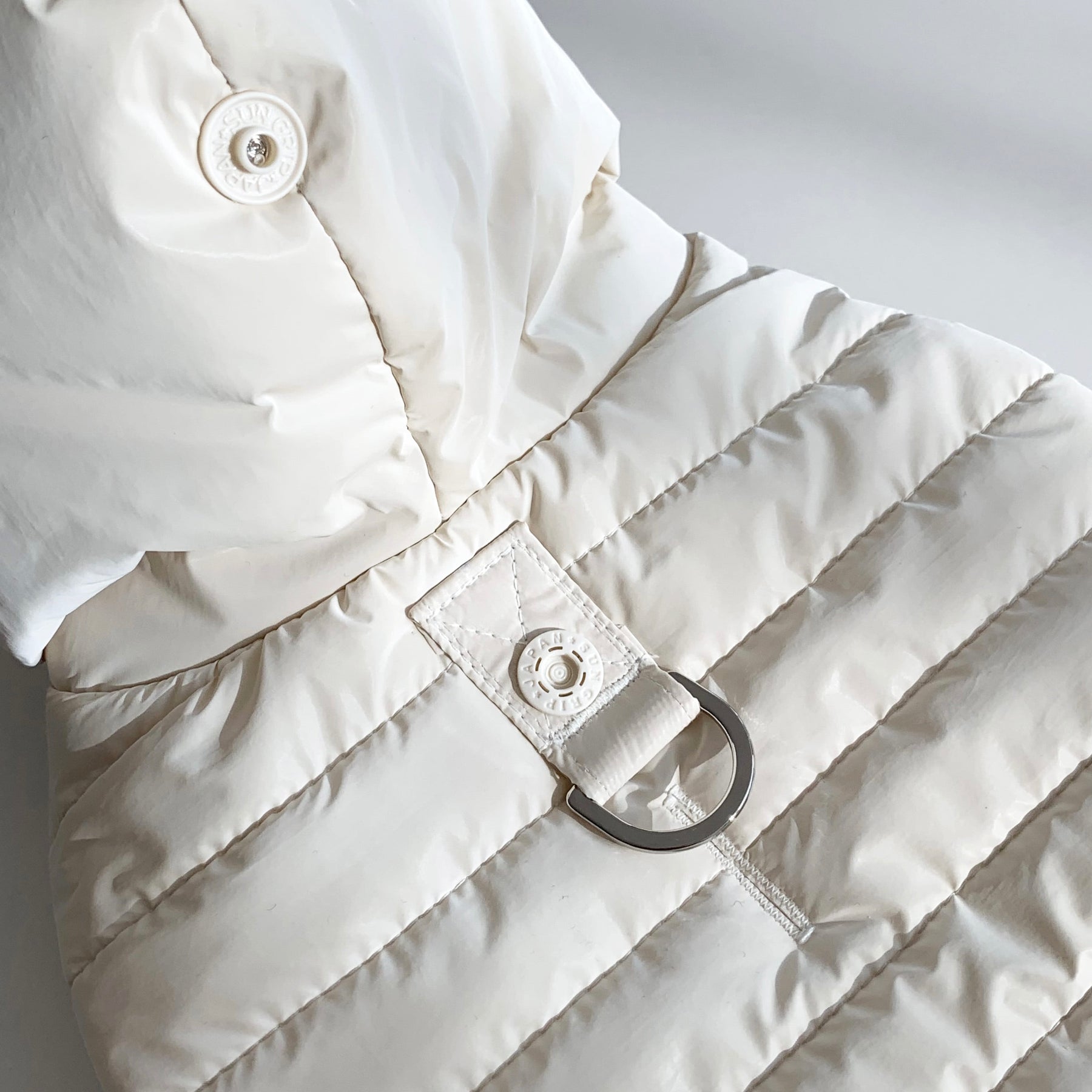 フードの揺れを防ぐフード固定スナップ付きで、フードの下にはリードを直接繋ぐことのできるDリングがついています。